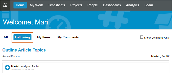 On the Home tab activity stream, toggle to Following to view recent updates and comments on all items you follow: