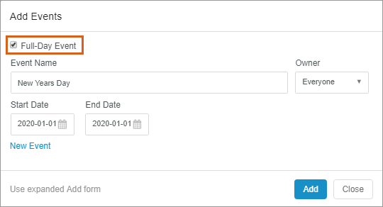 To create a Partial-Day Event, simply enter Event Name, Owner, Date and Start Time and End Time in the form and click Add.When adding a Full-Day Event, select the Full-Day Event checkbox first, then enter Event Name, Owner, Start Date and End Date and click Add.