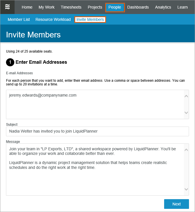 Each person will receive an email inviting them to create a unique LiquidPlanner sign-in. After completing the activation process, they will become an active member of your workspace.