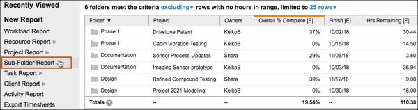 On the Analytics tab, you can report on key metrics at the sub-folder level such as hours logged, overall percent complete, finish dates and more. From the report options on the left side, choose the Sub-Folder Report option.
