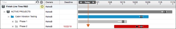 If the work in that phase is at risk of missing the deliverable date (the deadline), LiquidPlanner will provide advanced alerts as soon the date is at risk. Note in the image below that the Phase 2 set of work is not scheduled for some time, which you can see in comparison to the marker for “Today”. But LiquidPlanner is still driving alerts to indicate that this phase is at risk, providing advanced notification to make adjustments.