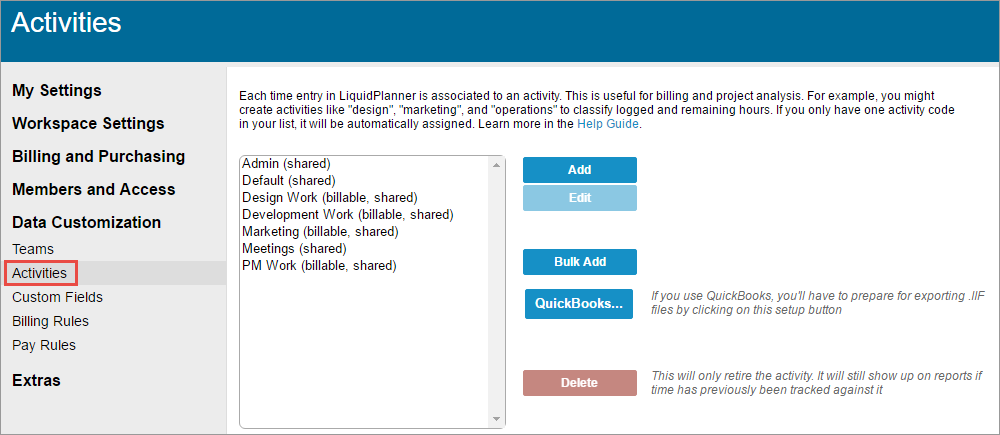 Create activities to categorize the work you do on a specific task and choose whether the activities you add are for billable or non-billable work. Workspace administrators can create activities via their User Menu > Settings > Data Customization > Activities.