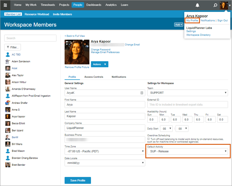 Workspace owners, Administrators and Managers can adjust the personal default activity for any workspace member. Go to the People tab Member List and select the member’s name to open their profile.