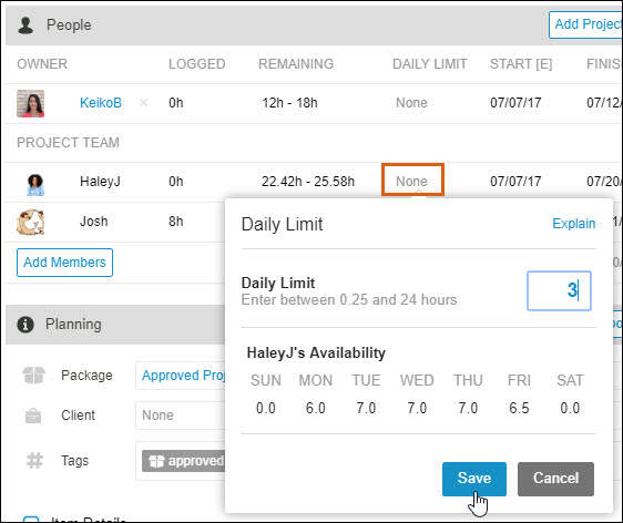 Setting a daily limit on a project can be used to limit the number of hours per day that a team member can be scheduled to work on a project. For example, when you have a team member working on two different projects, you can limit his/her availability for Project One to 3 hours per day, and Project Two to 2 hours per day.