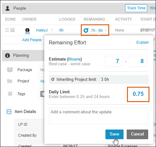 The LiquidPlanner scheduling engine references remaining effort, in addition to the Daily Limit setting. So remember to keep your remaining effort up to date! Daily Limits are ignored on items owned by Overdrive resources. You will receive a warning flag alert if a Daily Limit is applied to an overdrive resource.