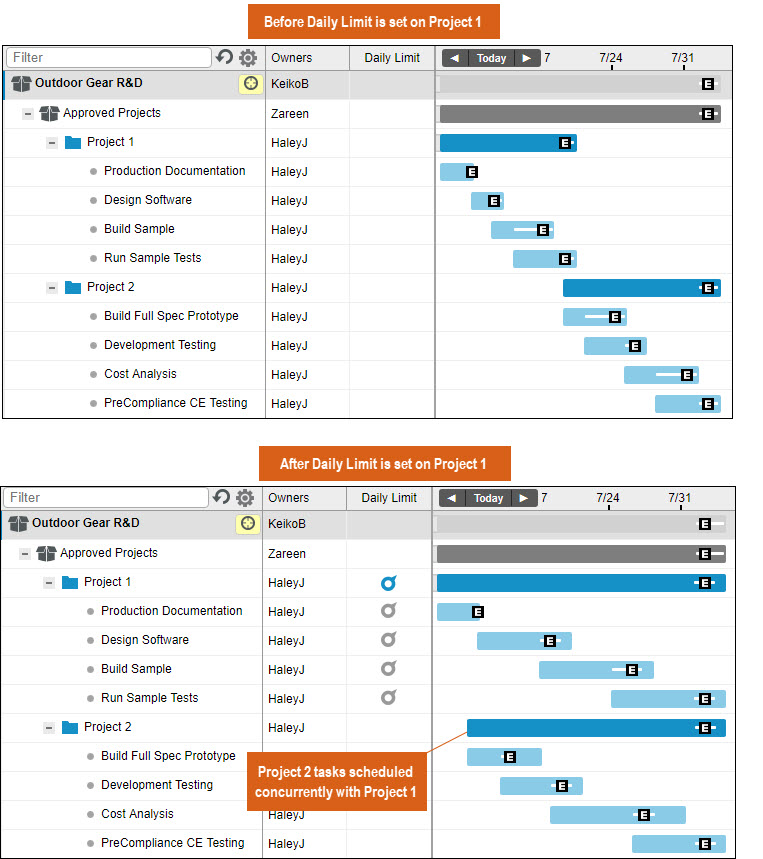 After the Daily Limit on the current project or task has been reached, LiquidPlanner will schedule your next available (highest priority) project or task to maximize your daily availability. For example, Project 1 and Project 2 are the highest priority projects in the workspace below. Before any Daily Limits have been assigned to Haley, she is scheduled to complete her tasks for Project 1 before moving on to Project 2. Once a 3 hour Daily Limit is set for Haley on Project 1, LiquidPlanner updates the schedule which visually models the Project 1 schedule bars running concurrently with Project 2.