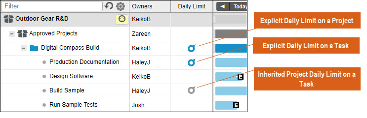 A blue Daily Limit icon is an explicit Daily Limit that has been applied directly to a project or a task. A gray Daily Limit icon is an inherited Daily Limit that a task has inherited from it’s parent project.