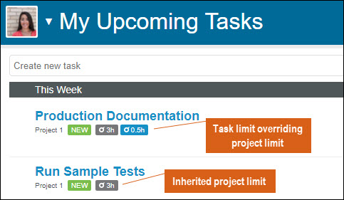From My Work, team members can see if a task has an explicit (blue box) or inherited (gray box) Daily Limit next to the task name. The box displays the actual hours set for the Daily Limit.