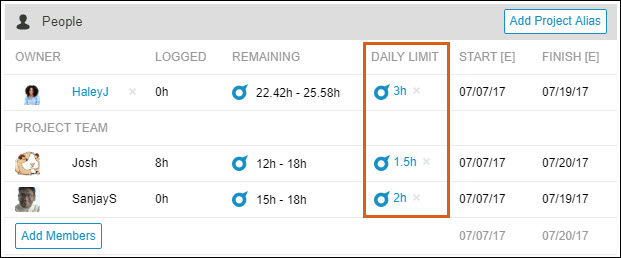 To find a Daily Limit set on a project, select a project > open the Edit Panel > scroll to People section. The Daily Limit column will show whether a Daily Limit has been set for any of the project team members.