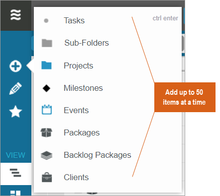 The following plan item types can be added from the Add Menu: Tasks, Sub-Folders, Projects, Milestones, Events, Packages, Backlog Packages, and Clients. Up to 50 items can be added at one time.