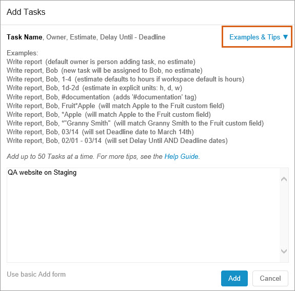 This form allows you to copy and paste a pre-formatted list of items to create all at once, and provides the opportunity to associate additional attributes to the plan items during the creation process. To see different syntax formatting options, click on the “Example & Tips” link.
