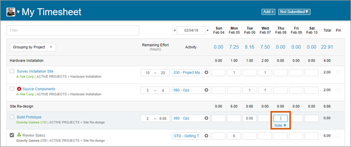 Time entry notations can be typed into the Timesheet note box. These notations will be captured in timesheet exports.