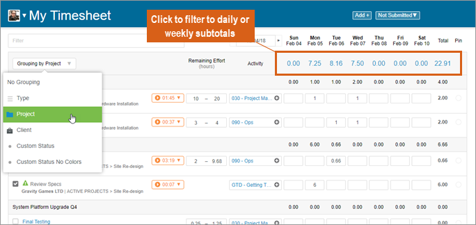 You can also group tasks on your timesheet by project, client, and custom task field. The blue figures below each date represent the subtotal of your time logged for that date, while the figure under Week Total represents a subtotal of all time logged for the week. Clicking on either the daily or weekly subtotal will filter your timesheet to only tasks to which time was logged.