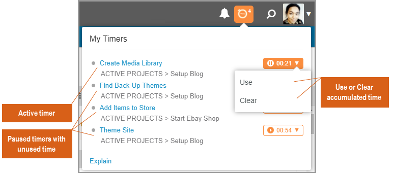 Clicking Use will apply the accumulated time to your timesheet. Clicking Clear will clear the accumulated time for that task.