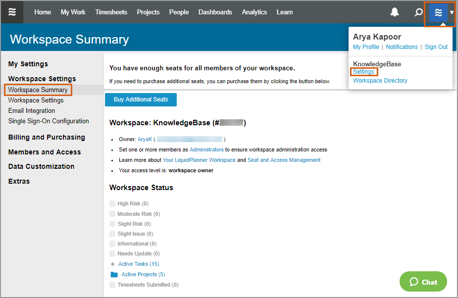 To access the Workspace Settings, go to User Menu > Settings: