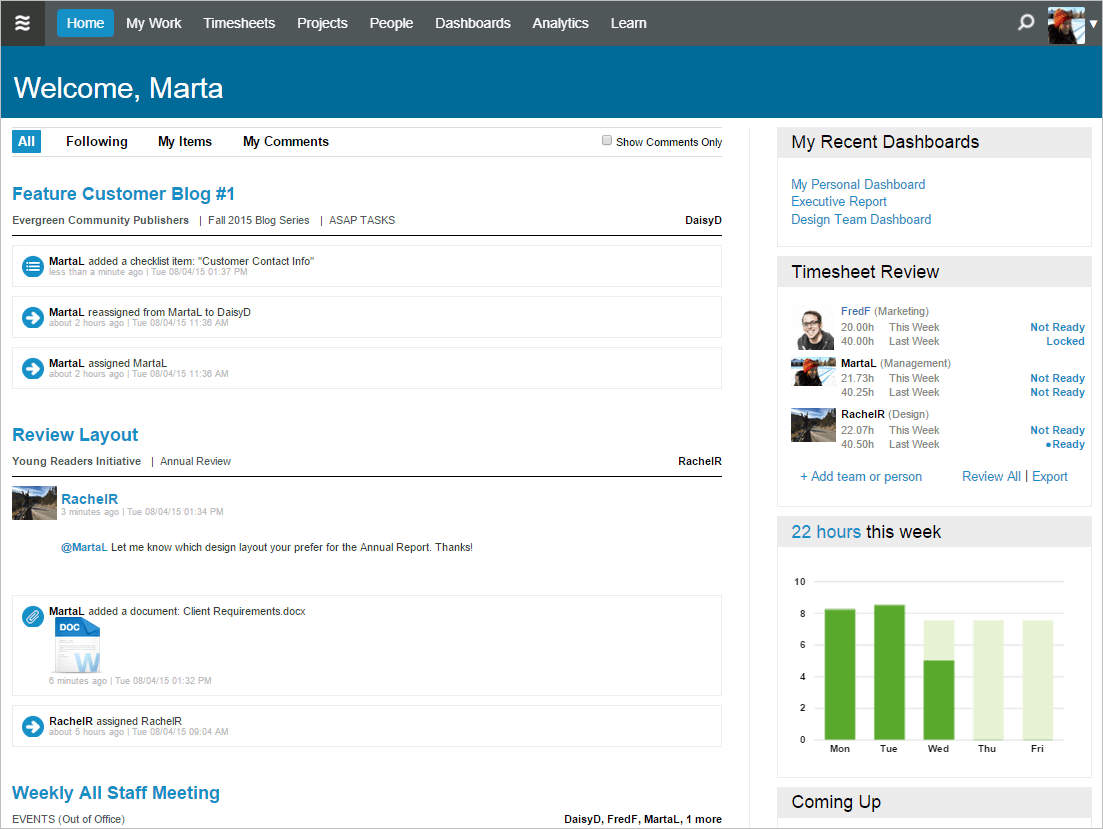 Main Purpose: The Home is the first place you land when logging into LiquidPlanner. It’s a helpful view for seeing recent activity, comments or other recent updates posted to work items. You can also view widgets that display information such as your weekly Time Tracking progress or a summary of work you have coming up This Week.