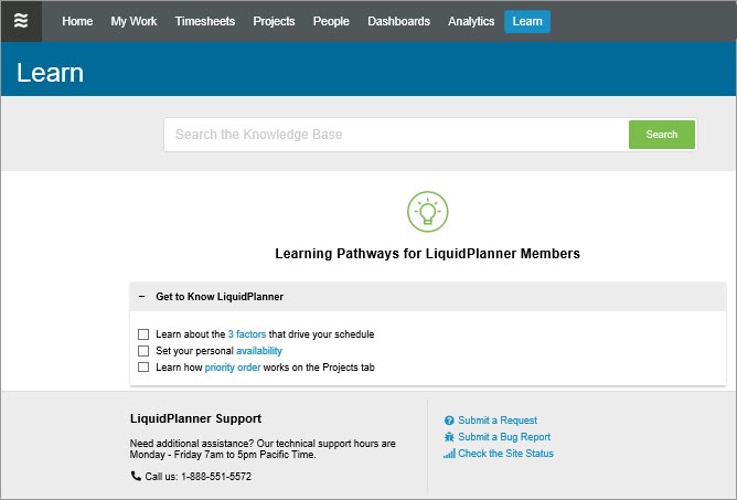 Main Purpose: You can Search our Knowledge Base articles for information on features or best practices within LiquidPlanner. You can also complete a learning pathway, or find information on how to contact LiquidPlanner Support.