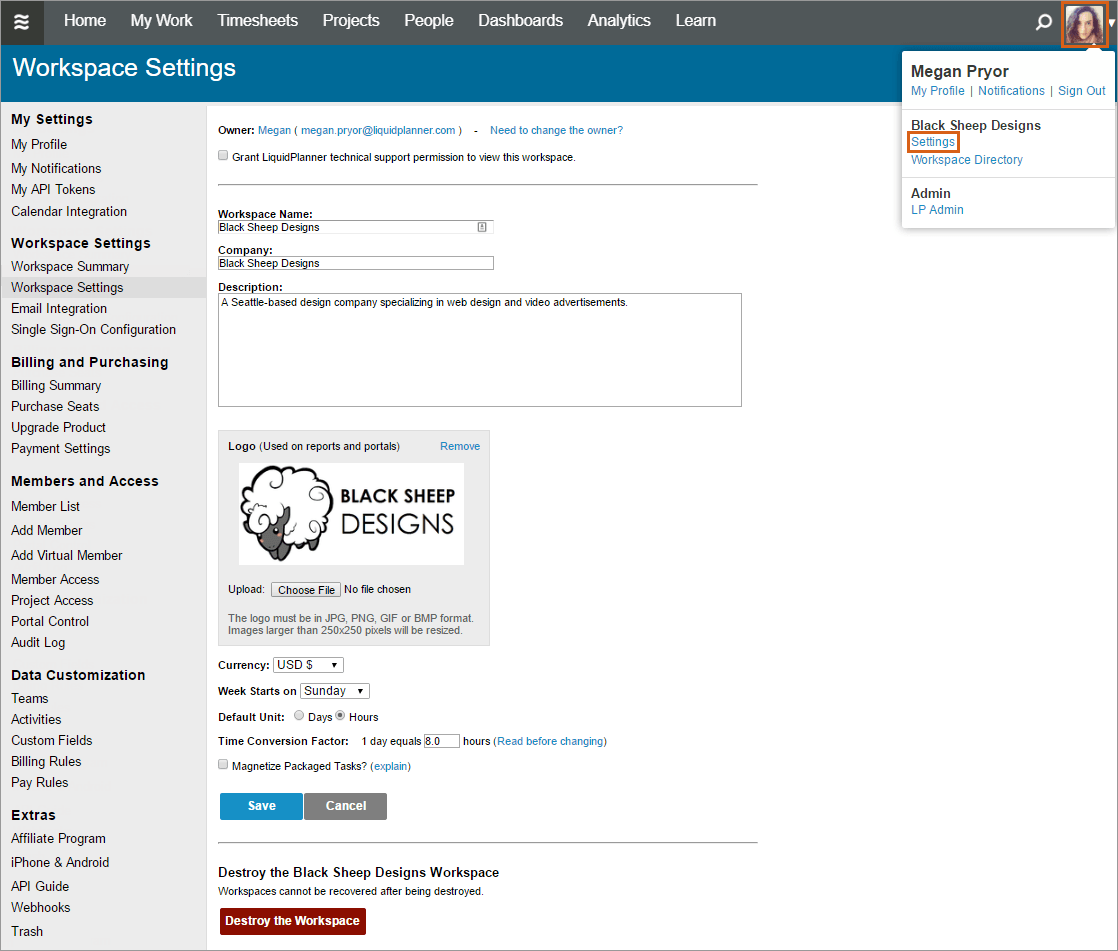 Main Purpose: All team members can access and update their personal profile or Notification settings from the User Menu. Administrators and Managers can also access the Workspace Settings from here. The Workspace Settings presented here are filtered based on your access level.