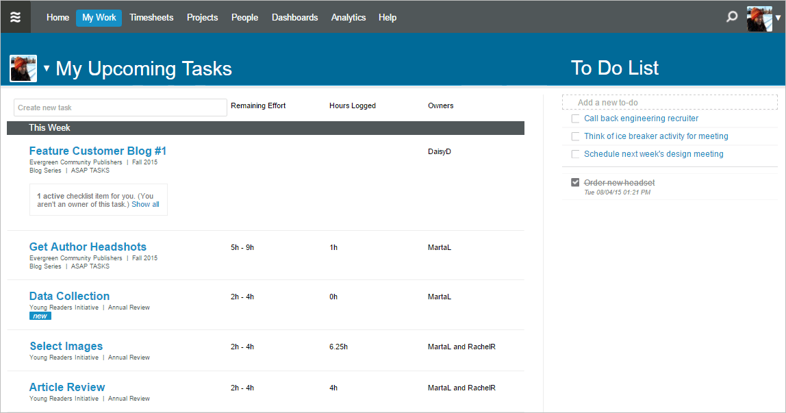 Main Purpose: My Work is the best place to focus on your upcoming tasks and quickly and easily post updates to your work. Your tasks are listed based on tasks with the earliest Start Date at the top. You can click on the task name to open the task’s edit panel, edit information about your tasks, log time, view checklist items, mark the task complete and more.