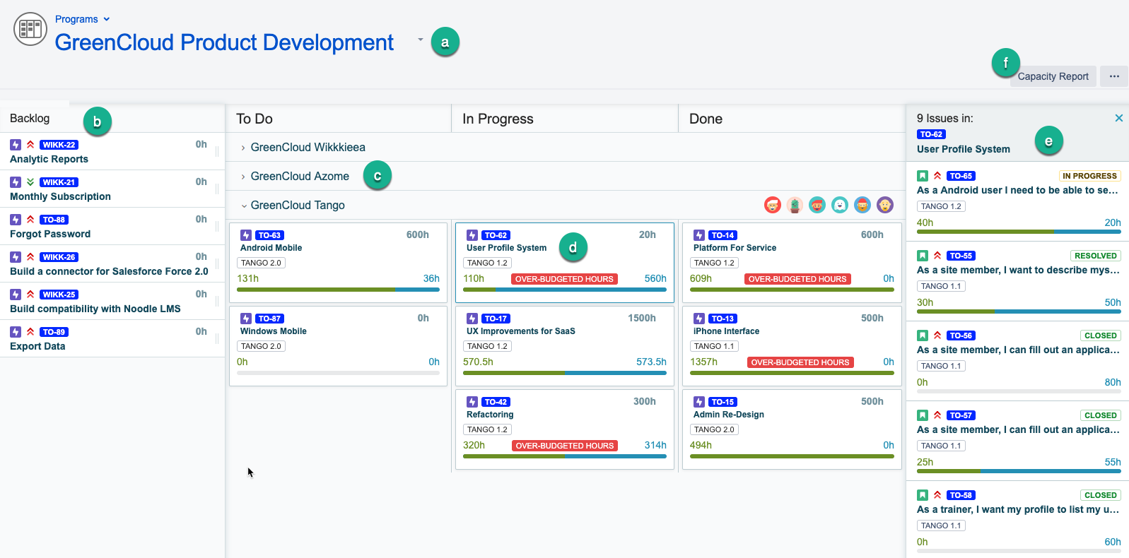Backlog: shows the project epics that are linked to the teams in the program. You can change the priority of an epic by selecting the epic that needs to be moved and dragging it to the desired place in the backlog.