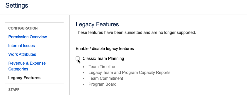 Classic Team Planning are team planning features that were made "Legacy" Features in Tempo Capacity Planner 7.13.0. These features continue functioning for all customers who were already using them, but are disabled by default for all new users. Classic Planning is accessible as a legacy feature, but you need to enable access to view it.
