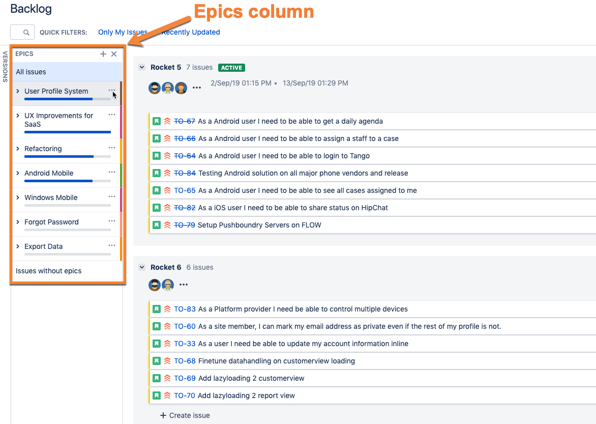 Figure 1. A Jira scrum backlog that shows the EPICS column and two sprints, which are called 'Rocket 6' and 'Rocket 7.'