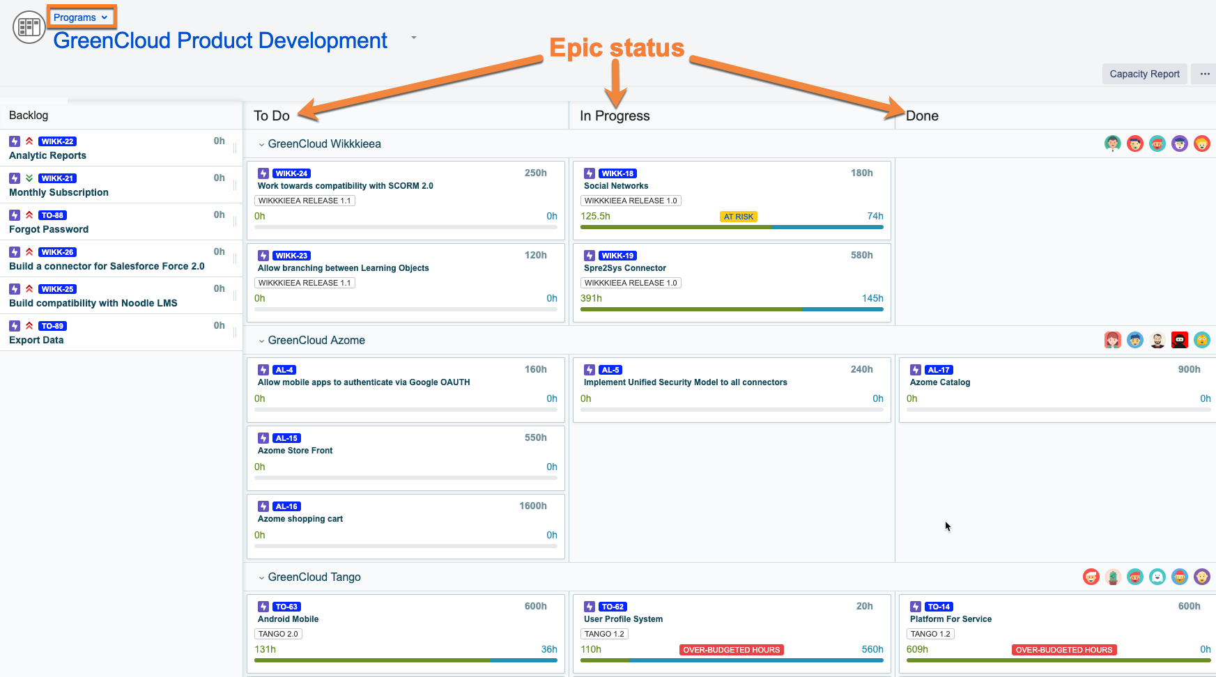 Figure 2. The program board in Tempo Planner, where a program manager can give epics to different teams and update the epic status. If an epic is dragged to a different column, the epic status changes.