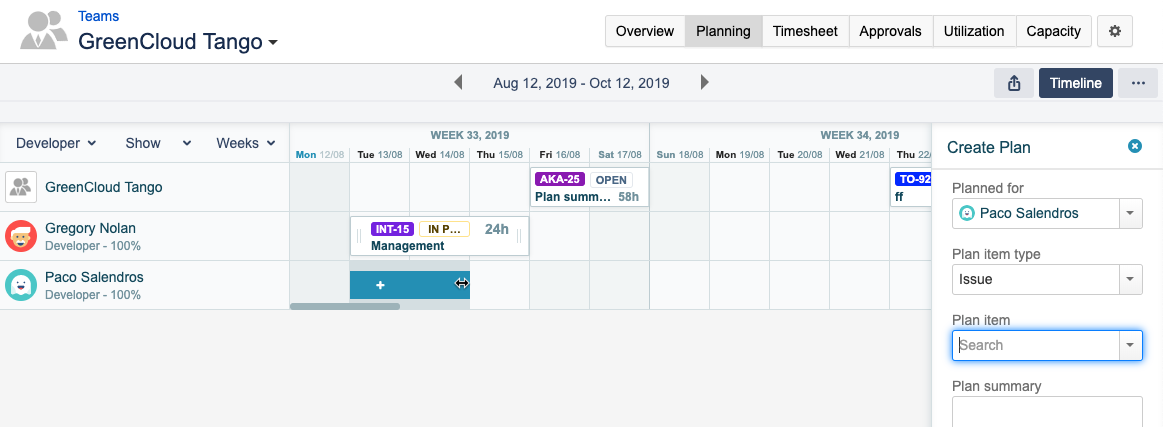 In the Team Timeline you can create a plan for a team member or for the whole team to work on an issue, project, version, or component.