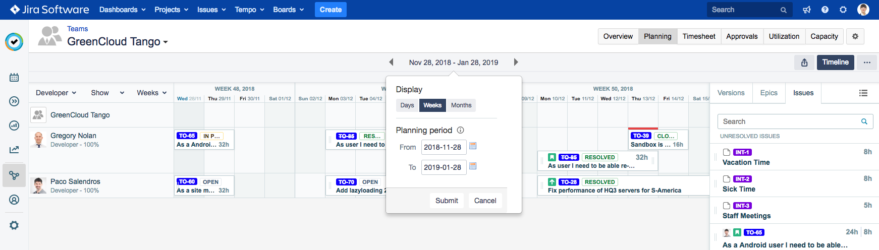To change the date range of the team planning timeline, click the date box, and choose between Days, Weeks, and Months.