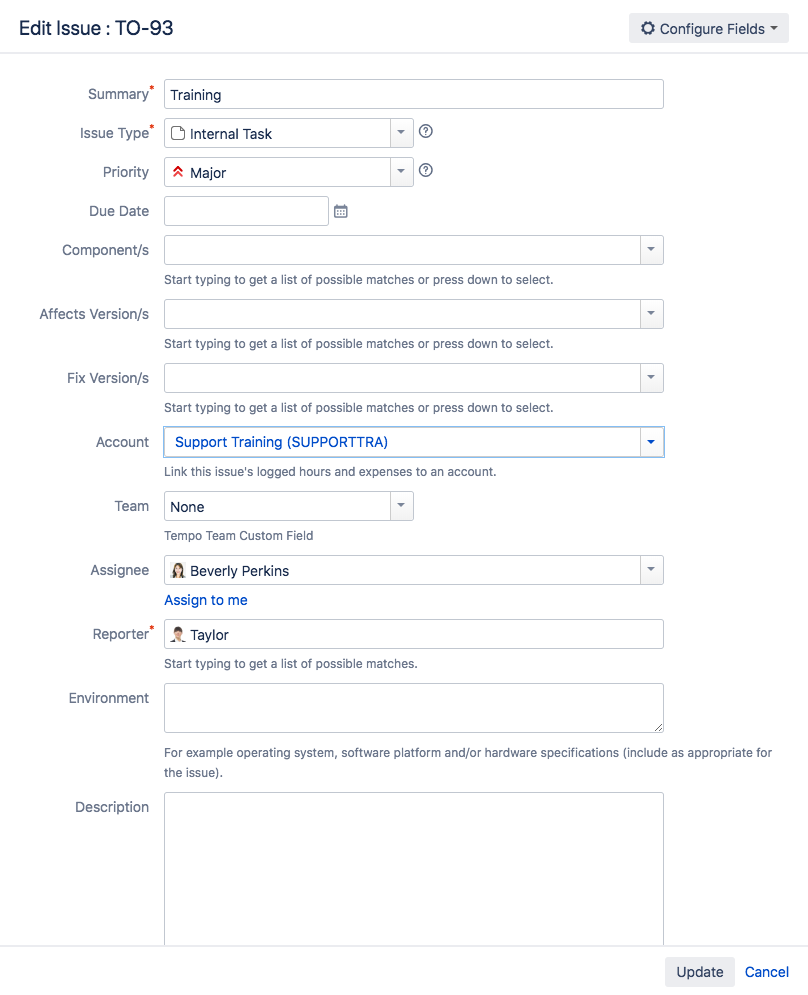 Similarly, the project issues relating to operational work, such as training, need to be linked to an OPEX account. Open a training issue and link the Support Training account created in Step 2 to it.