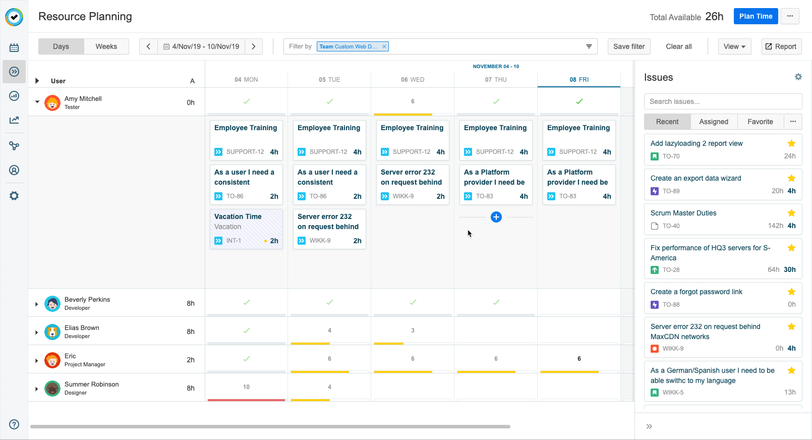 In Resource Planning you get a high-level view of all your resources and how they are allocated. You can see how much time is available in total for the selected period as well as time available for each resource. You can sort the resource list and expand it to view plan details for each resource. You also have other view options, such as selecting to focus on the daily details in the Days view or viewing a longer-term overview of availability in the Weeks view.