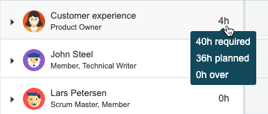 Resources are displayed on the left-hand side, followed by their remaining available hours for the selected period. When you hover over the available hours, a tooltip shows the number of hours required, planned, and overbooked.