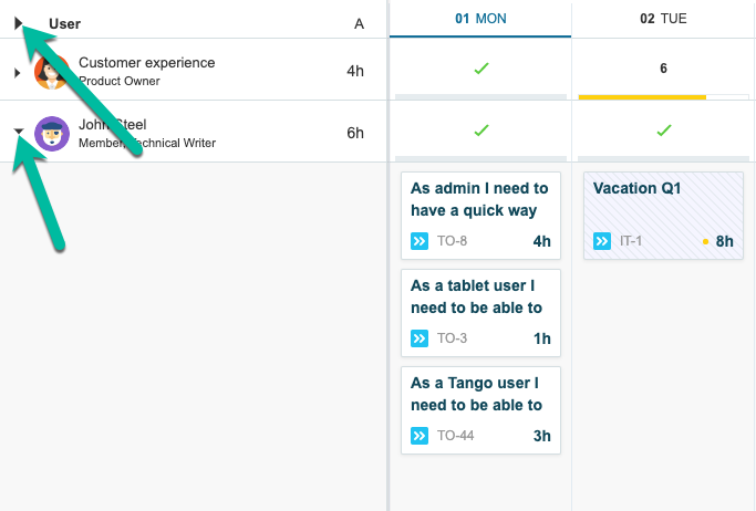 Clicking the triangle to the left of a team member allows you to view all of their planned tasks and make changes to their schedule. You can also expand all resources at once by clicking the triangle next to User at the top of the resource list.