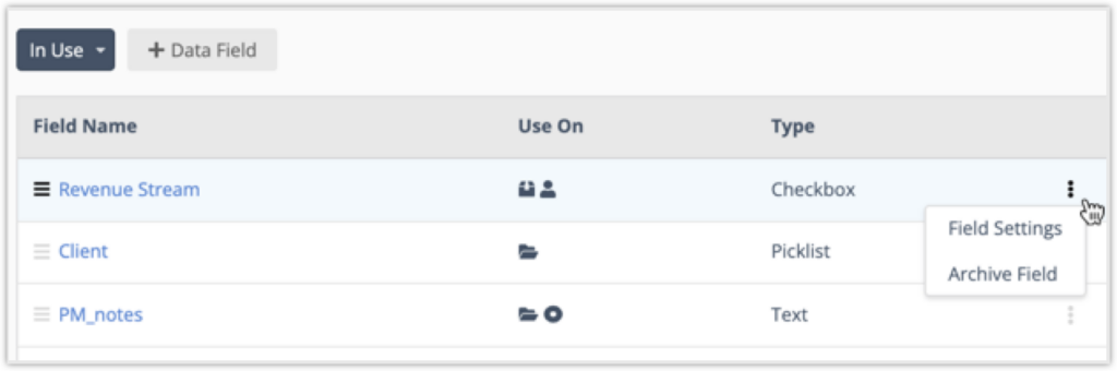 Picklist | A category with multiple values that are pre-defined. Users select a single value from a list when updating this field. | Create a Client field with values representing each business you serve. Use the field on Projects and Tasks to track work by client. |