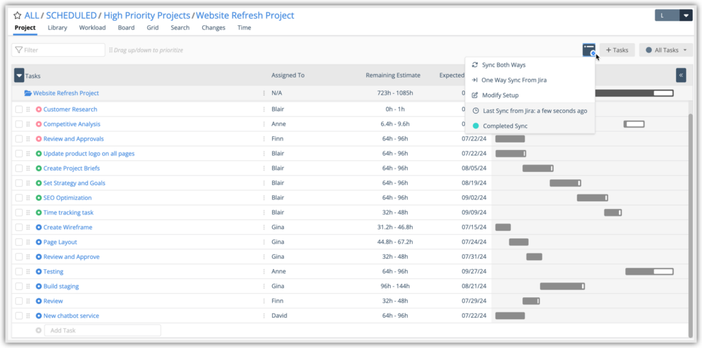 Sync Both Ways: Pull in the latest Jira updates, including new issues, and send Portfolio Manager schedule data back into the Jira Project. Specific updates that can be sent back to Jira include a task status change, re-assignments from one person to another, task priority position (overrides Jira issue rank) and Priority custom fields.