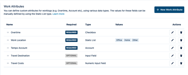 Work attributes are custom fields that you can add to worklogs so that users can record detailed information about logged time. For example, you can use work attributes for tracking hours to Accounts, "Overtime", or "Travel time".