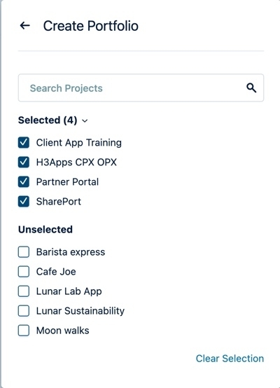 The number of Selected projects is shown versus the number that remains Unselected for this Portfolio.Optional: Enter the Description to be given to the new portfolio.