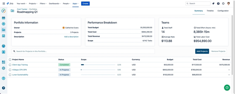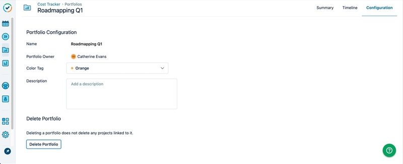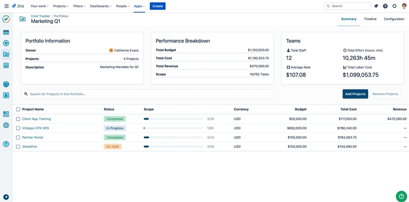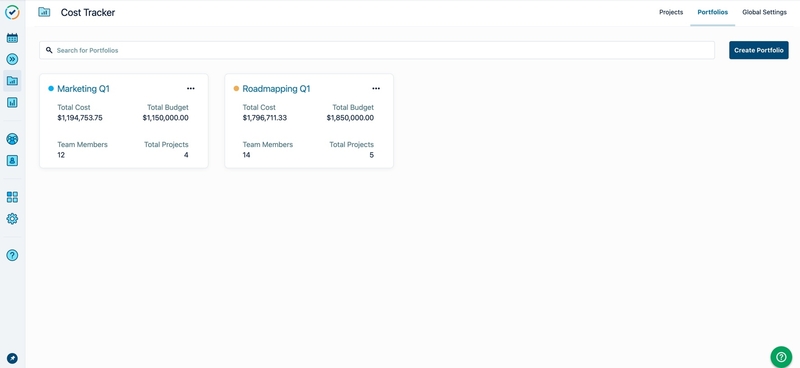 Portfolio managers are able to create different portfolios and pull in the relevant projects. This provides the ability to track project metrics such as the remaining budget, time spent, and progress at the portfolio level.