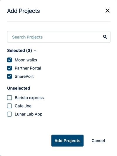 Click to select from a list of projects, or enter a string to start searching for the projects you want to add.