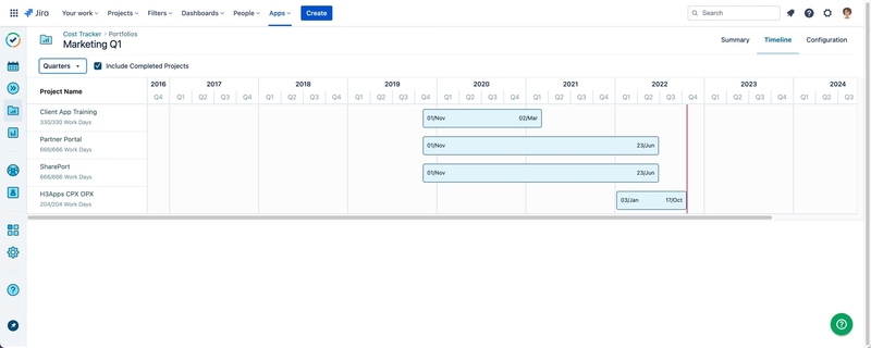 The portfolio's Timeline page lists the progress of the active projects in a horizontal bar view in a monthly or quarterly span. The timeline is based on each project timeframe, or on a fixed timeframe. If a project has a scope and worklog, those are calculated and displayed in the Timeline.
