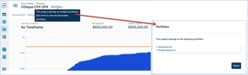 The Project Portfolios feature can facilitate the work of managing multiple projects aimed at achieving the same objectives. Projects can be grouped together in a Portfolio to gain insight into how a portfolio is performing based on the aggregated budget, cost, revenue, and scope of the projects in the portfolio.