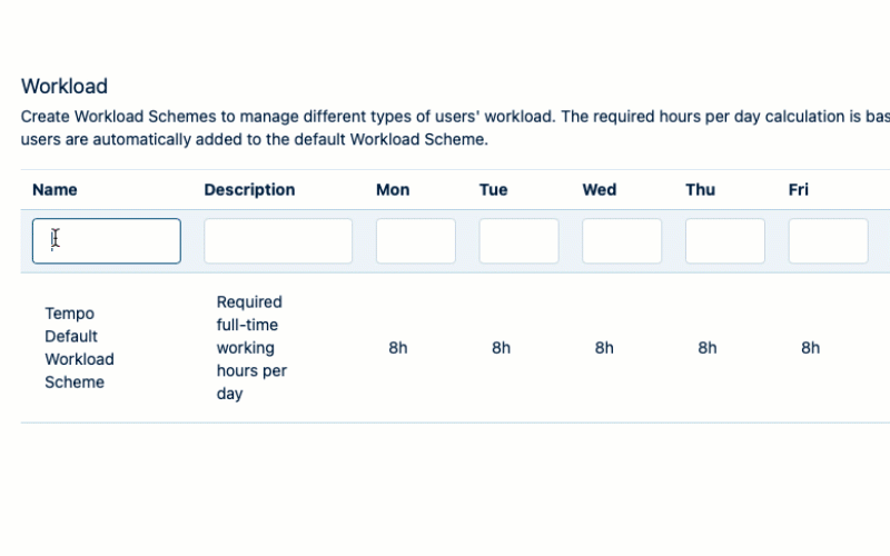 You can create different workload schemes to address different working hour requirements, and then assign the members to their appropriate scheme. For example, employees who work in different countries might have different working hour requirements, or some employees might be working only part-time. All Tempo users must be assigned to a workload scheme, and by default, everyone is added to the Tempo Default workload scheme. When a new user is added to Tempo, they are automatically added to the default scheme.