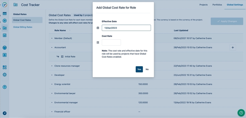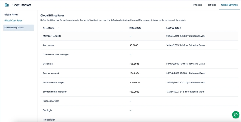 Cost rates and Billing rates can be set globally in Financial Manager. The global rates are managed and maintained in a centralized page to assist project managers in setting rates globally for team member roles.