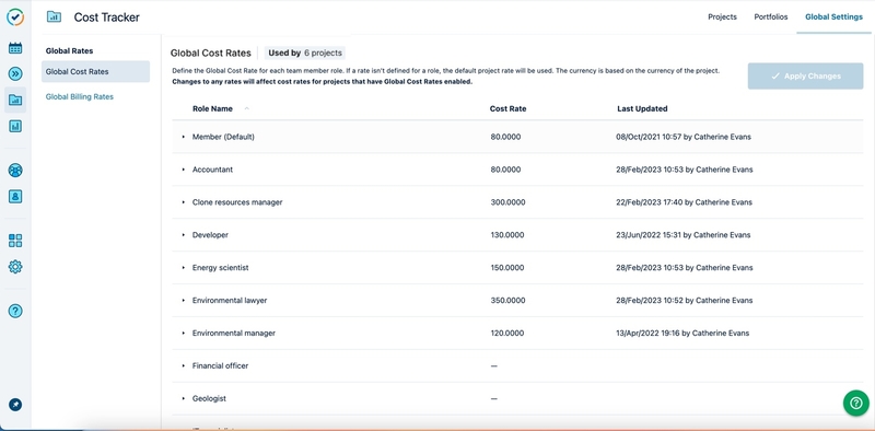 Global Cost Rates are role-based rates set globally for all Financial Manager projects. These rates are defined for each role at the application level and applied wherever the roles are assigned to team members working on projects. Projects should be enabled to use the global rates in project configuration otherwise, the project-level rates will be used by default.