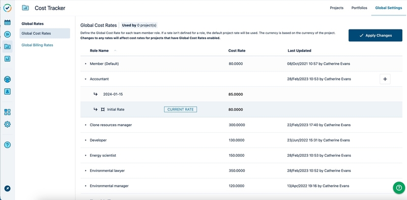 Initial Rates cannot be deleted but they can be reset to null. When the initial rate is null and no effective date is defined for the role, the default hourly rate will replace the Global Cost Rate for the team member in projects.When done, click Apply Changes.