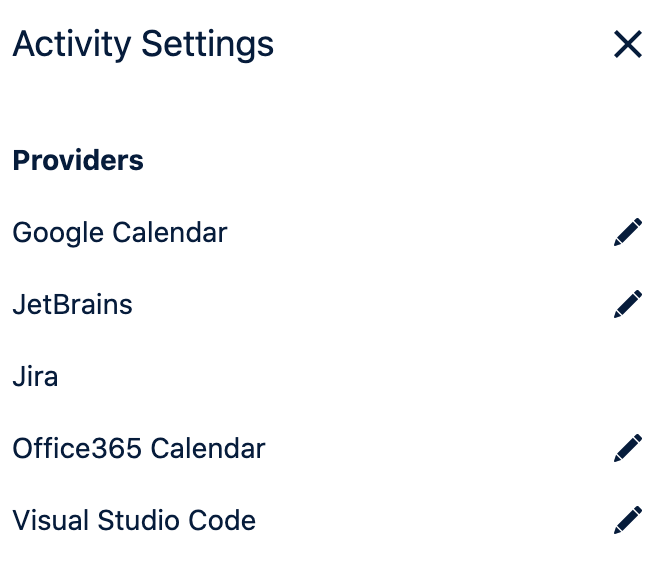 In the Activity Settings, click the edit icon next to a provider. You might need to install the associated app in the Tempo Apps page. Jira is always connected.