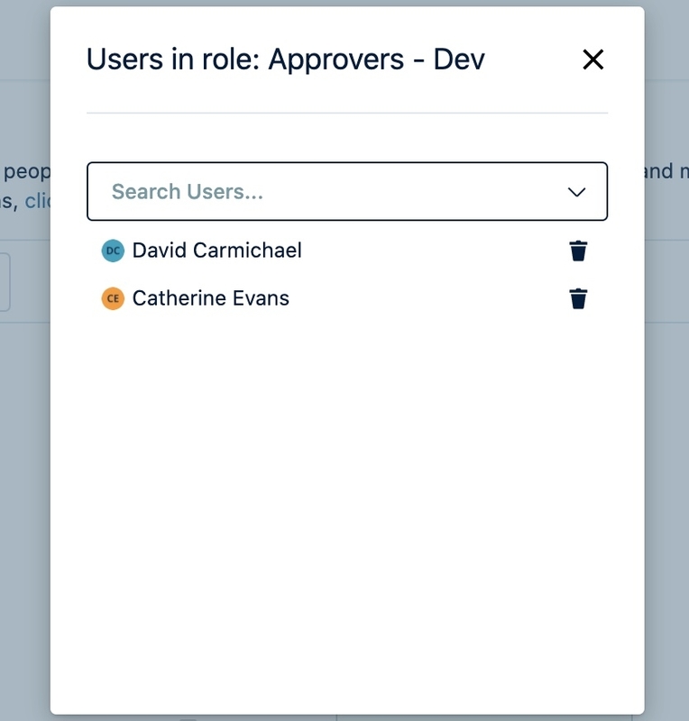 Add or remove users from a permission role by clicking on the user names in the Role users field, then adding or deleting users in the dialog box.