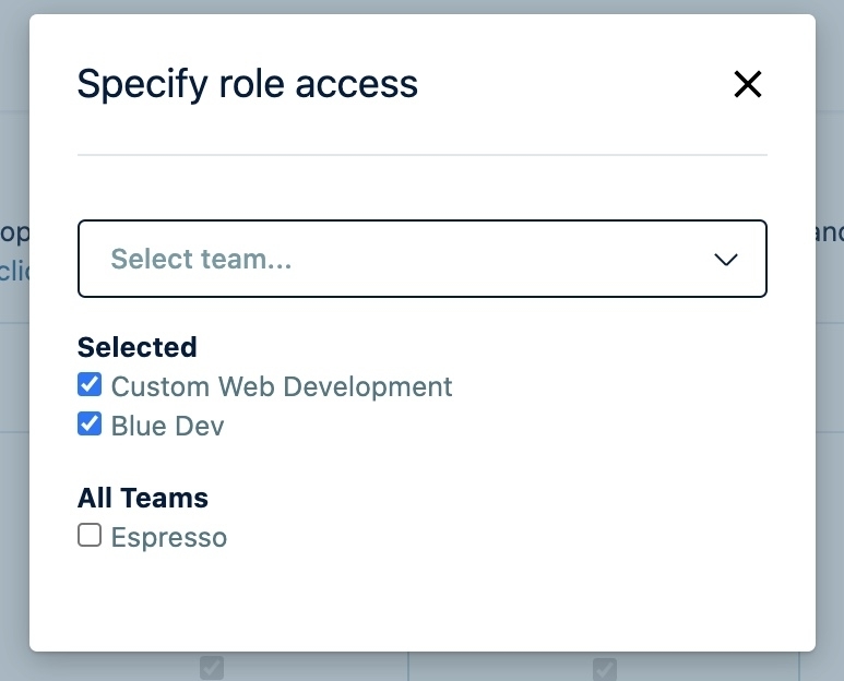 Add or remove teams included in a Restricted permission role by clicking on the team names in the Role access field, then adding a team or removing its access in the dialog box.