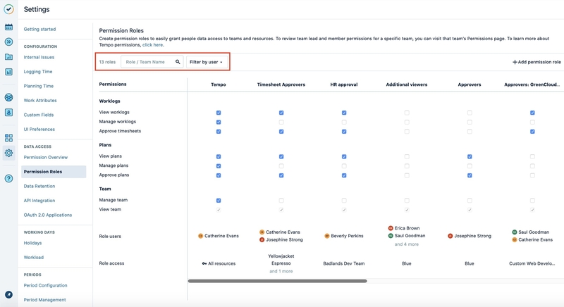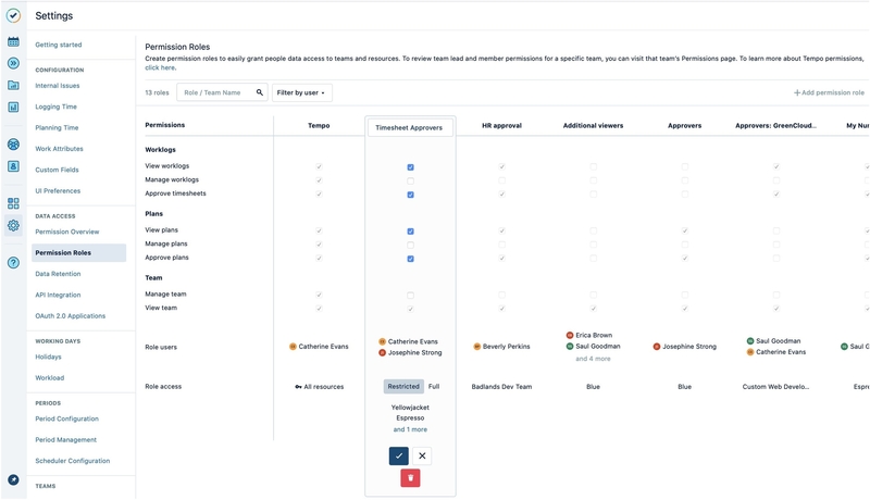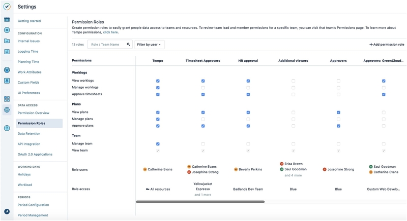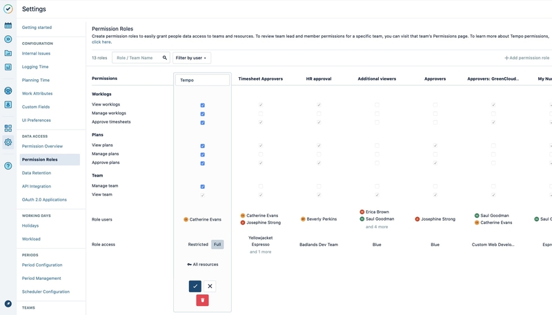 Tempo permission roles let you grant specific permissions to Tempo users. In cases where managers need access to multiple teams – or even to their entire organization – you can create permission roles to give them the permission to view, manage, and/or approve all plans and timesheets, as well as manage teams. The Permission Roles page in Tempo Settings allows you to create these multi-team and/or full permission roles quickly and easily, as well as get a clear view of who has access to which teams' data.