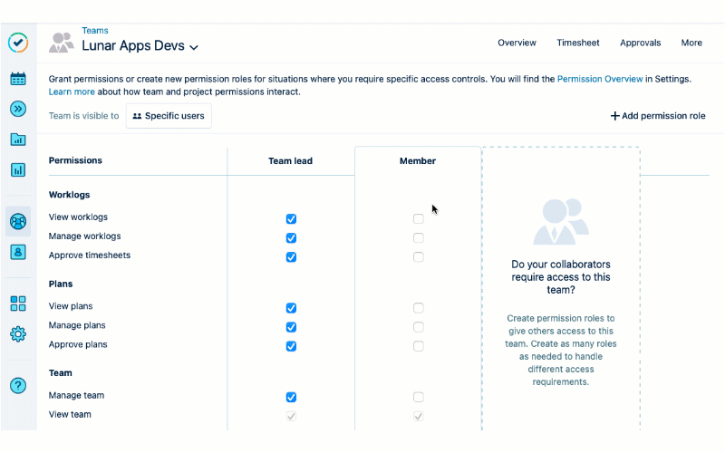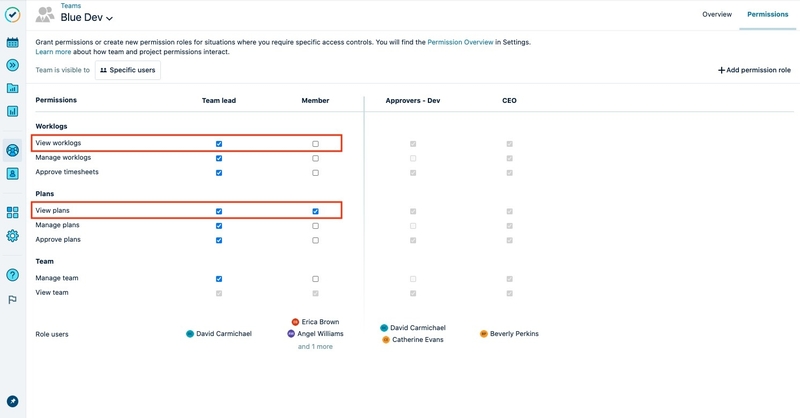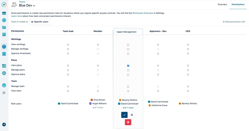 You can create permission roles for whatever purpose you need, such as giving other managers or administrators the ability to approve timesheets or plans, or giving a senior team member the same permissions as the team lead to have a backup. It's also easy to add people to - or remove people from - an existing permission role.